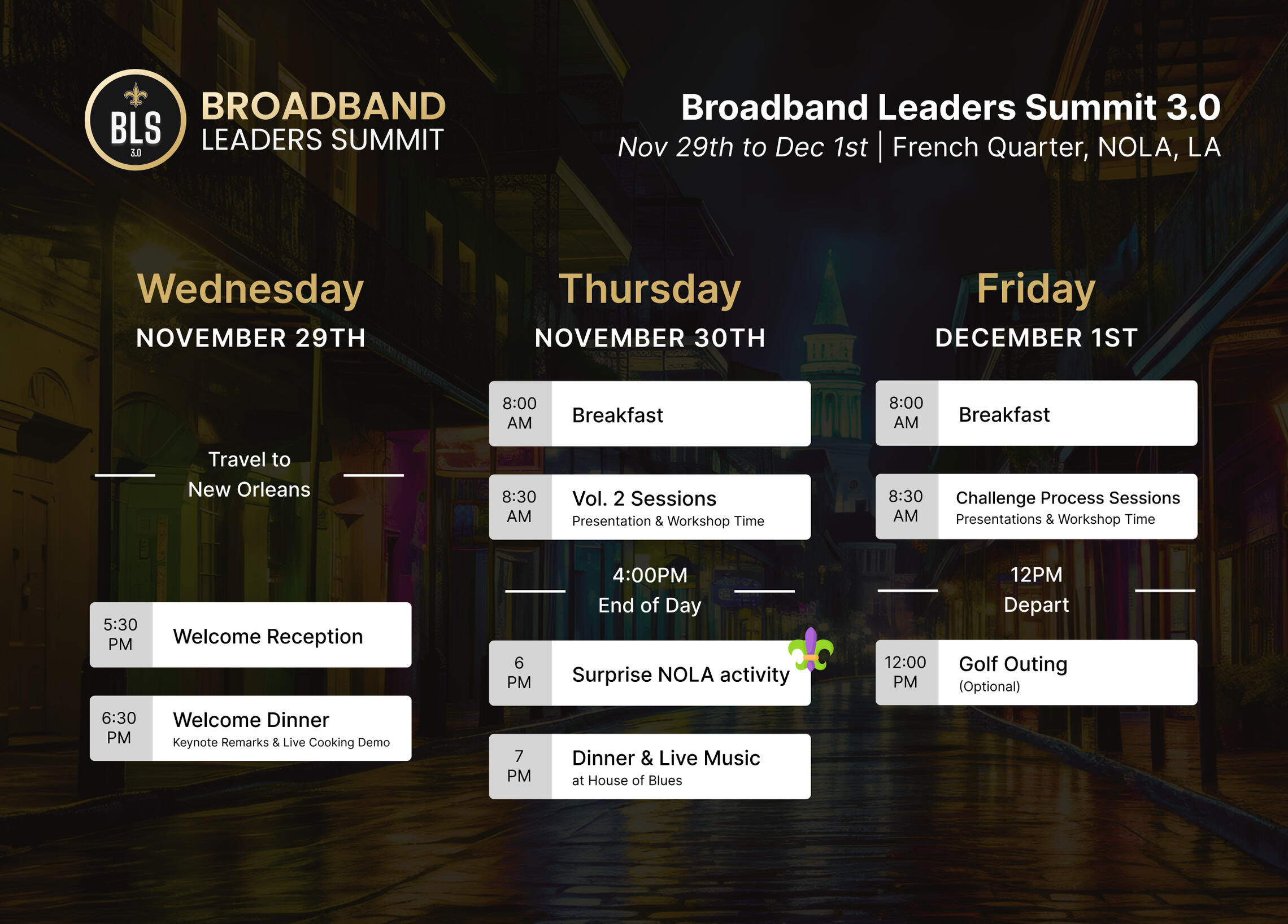 With limited availability, time is running out to secure your spot. Register now to secure your spot at the Broadband Leaders Summit 3.0 in NOLA. Request an invite now or email us for further assistance.To request your invite, please include your full name, title and reason for interest. We look forward to connecting with you!